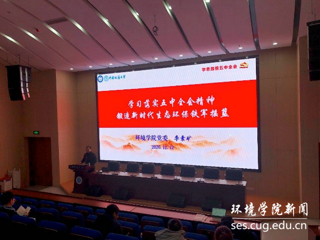 如何学习好贯彻好落实好十九届五中全会精神?李素矿结合环境学院实际发展目标和新型研究型学院建设,提出要坚持党建领院、以史铭院、学术立院、特色建院、人才强院、文化兴院、开放活院、依法治院为治院理念。在党建中对标对表,全面落实从严治党责任,健全完善治理体系,发挥好“三大作用”,对标对表,做齐规定动作,坚持“不忘初心,牢记使命”主题教育常态化;要突出学院特色,推进张国旗班行动计划、深化美丽中国4+N课程思政、用好1+6院本育人资源,创新高质量人才培养体系,推进水土气生环跨学科教育、跨学科研究,培养新时代红专能优生态环保铁军。