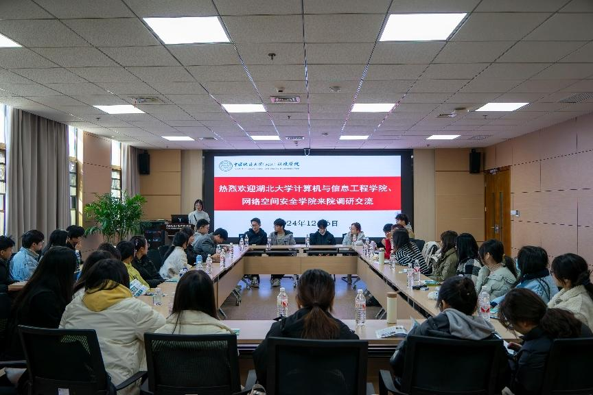 (通讯员陈俊男 摄影/编辑耿婧)12月6日,湖北大学计算机与信息工程学院党委书记秦明君,党委副书记覃红英,网络空间安全学院党委副书记马兴建,湖北大学-贵州税务研究生工作站党支部书记崔海波,辅导员汪诗琪、朱奎闽、张剑恒以及30余名学生来我院调研党建“双创”和人才培养工作。我院党委书记姜明敏,计算机学院党委副书记林小艳,计算机学院应用系党支部书记武云,我院院直党支部书记张学海,辅导员孟庆达、陈俊男、赵恩民以及党团学生代表等参加相关交流活动。陈俊男主持本次调研交流。