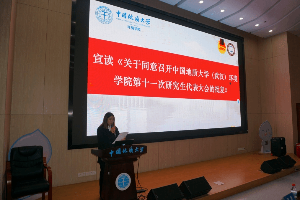 校研究生会主席团成员陈薇宣读《关于同意召开中国地质大学(武汉)环境学院第十一次研究生代表大会的批复》。