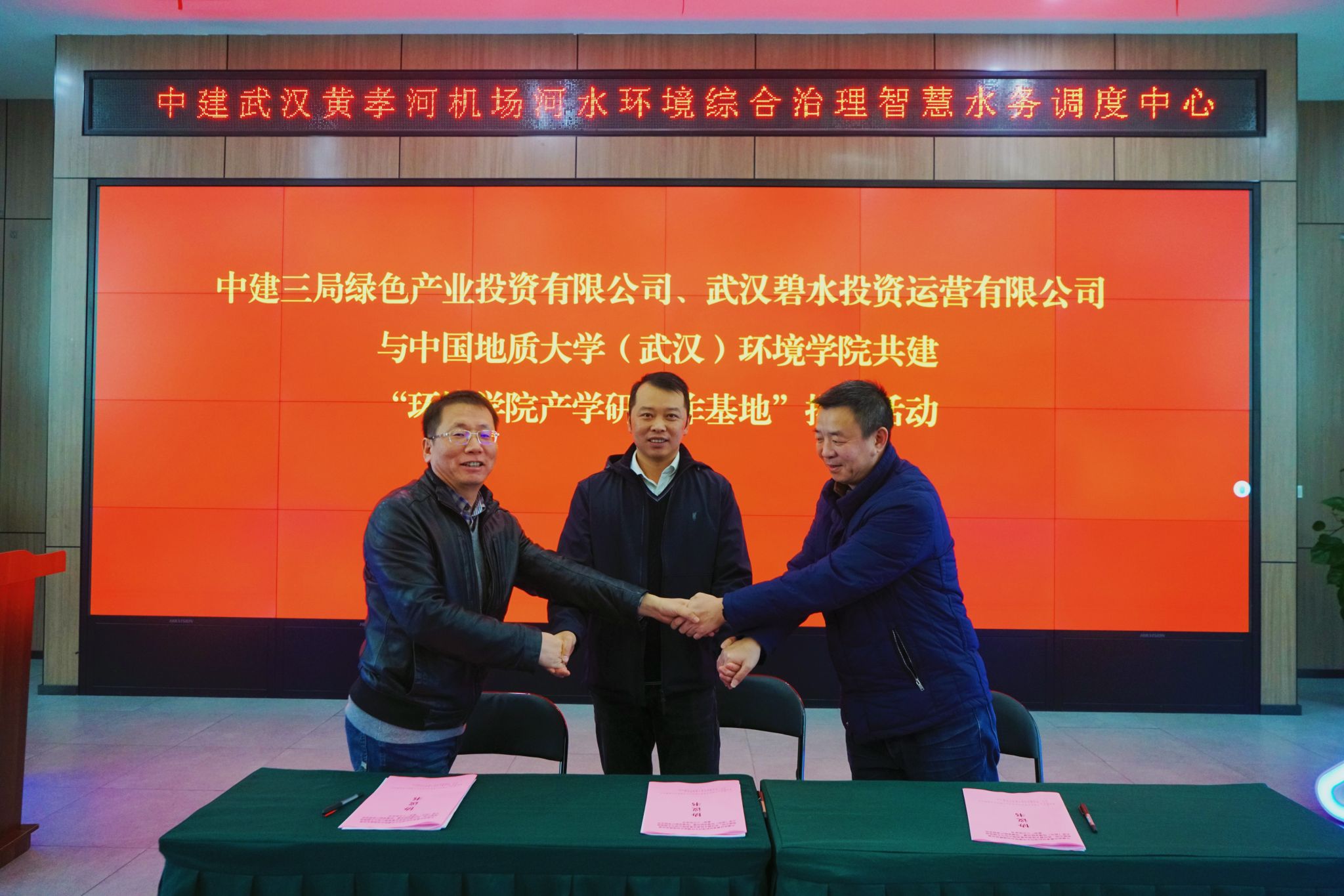 随后,三方代表围绕流域治理、污水处理、技术创新等议题展开交流研讨,今后将充分发挥各自优势,创造良好条件,探索“产学研用”有机结合新模式,共同构建产学研联盟创新体系。三方在活动现场签署共建合作协议,并共同为基地揭牌。环境学院党委书记姜明敏表示,学院与中建三局绿投公司、武汉碧投公司有着良好的合作基础和共同的发展愿景,为企业应用场景提供力所能及的服务是学院科技创新、学科建设的应有之义和价值所在,期待三方通过共建产学研基地实现优势互补、合作共赢,在产教融合、业务培训、成果转化、项目合作、学生就业等方面取得新的进展和突破,共同为美丽中国建设和地方经济社会发展贡献智慧和力量。