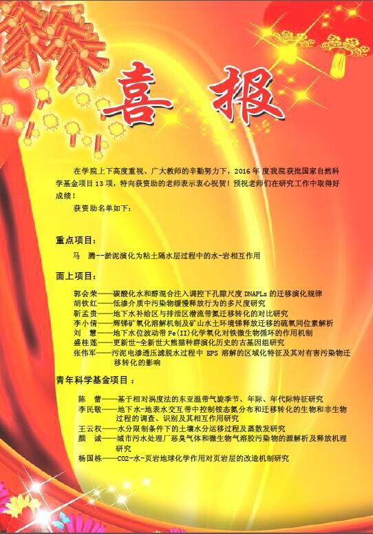 喜报——热烈祝贺环境学院2016年国家自然科学基金创佳绩