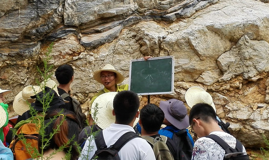转眼实习已经第八天了,柴老师的伤仍不见好转,可他却继续带同学们来到了路程最长的一条路线——八角寨。漫长的周张公路,沿途需要观察、描述、记录的地质点有很多,为了不让自己的腿脚影响进度,他说,“我笨鸟先飞,你们记完野簿追我”。就这样,每到一个点,柴老师先清晰地讲解完地质意义,为同学们留出思考问题后立即向下一个点前进,让大家记完野簿之后去“追”他。慢慢的,同学们追上柴老师的时间越来越短,他身上的衣衫早已湿透,有的同学提出要搀扶甚至背他时,他却婉然谢绝了,只是笑着感谢同学们的好意。六个小时的路程,柴老师就这么挺了过来,大家都看在眼里,疼在心中,只有柴老师看到大家出色地完成了当天的野外任务时,才是最开心的。