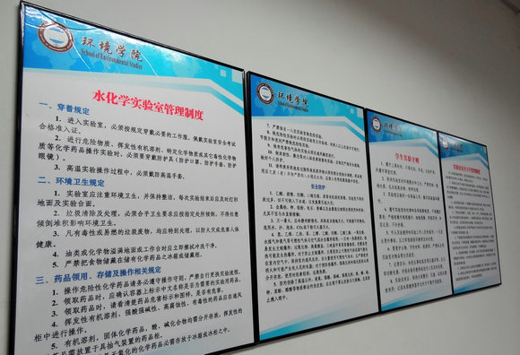 环境学院现有3个博士后流动站(含1个共建站)、2个一级学科博士点和4个一级学科硕士点,涵盖5个博士点、7个硕士点以及4个本科专业,涉及的学科门类较多,因此,教学与科研实验室涉及类型较多,包括有危险化学品类、辐射类、生物类等,学院实验中心根据各实验室的特点与要求,从防护措施、安全警示、安全教育、安全检查、应急预案等方面分别制订出各实验室特有的规章制度,并对所有实验室开展制度上墙工作。