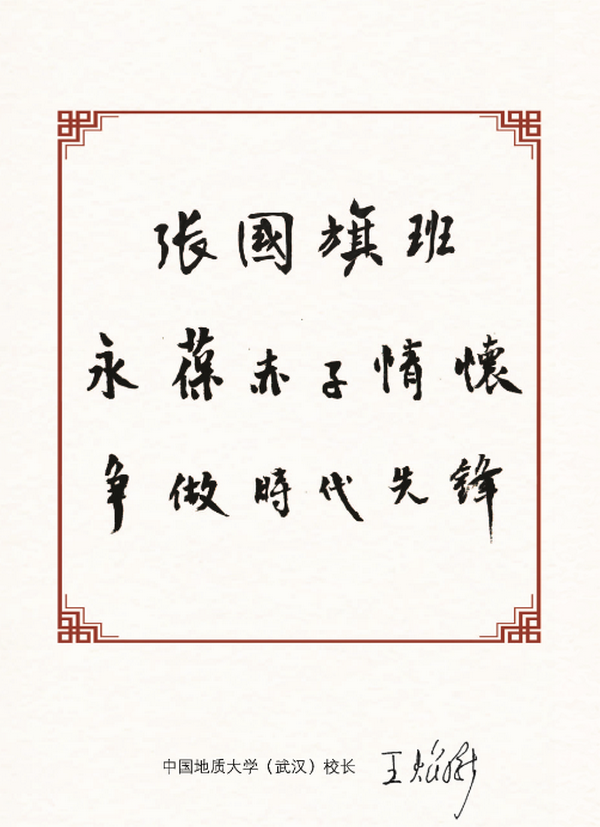 (通讯员:李平 编辑:张学海)环境学院党委创新实施“张国旗班”行动计划,校长王焰新为“张国旗班”题名,并寄语青年学子:“永葆赤子情怀,争做时代先锋”。