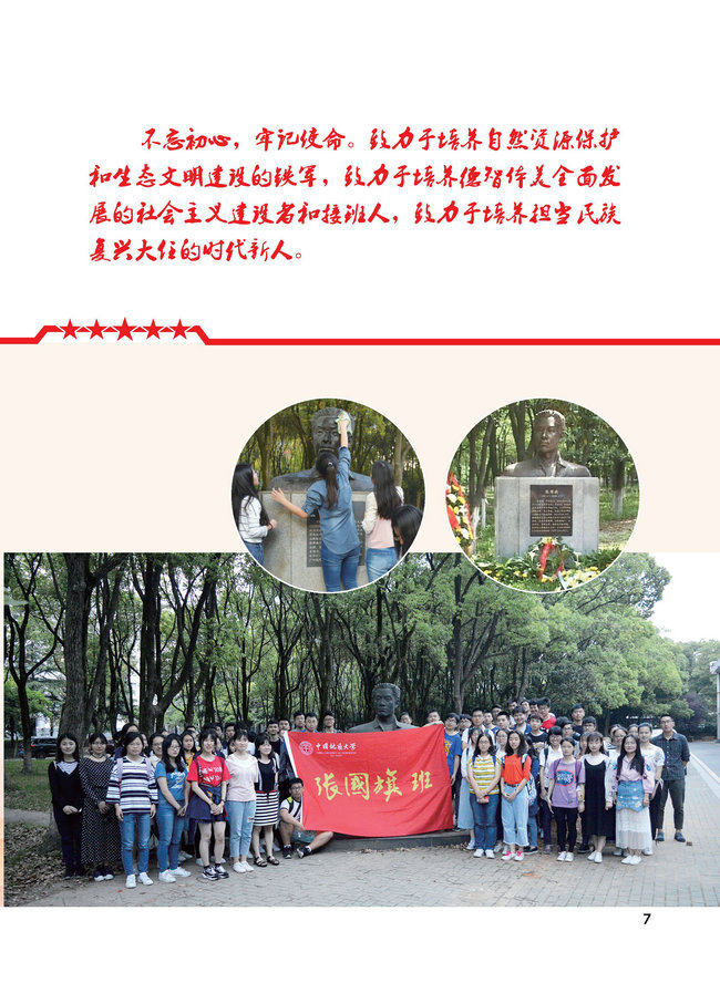 “张国旗班”行动计划,以政治坚定为出发点,以专业精湛为切入点,以能力过硬为着力点,以素质优良为落脚点,聚焦人才培养中心任务,坚持育人导向和问题导向,推进跨学科专业交叉融合、教学与科研实践融合、创新创业教育与专业教育融合,充分挖掘学院层面育人元素和学院微观育人逻辑,统筹规划立德树人根本任务,构建水、土、气、生的大环境学科群一体化育人模式,将“三全育人”融入学院人才培养、科学研究、社会服务、文化传承创新和国际交流合作之中,贯穿学院一流学科建设和湖北省改革试点各项工作任务,致力于培养自然资源保护和生态文明建设的铁军,致力于培养德智体美全面发展的社会主义建设者和接班人,致力于培养担当民族复兴大任的时代新人,为国家输送更多更优秀的自然资源保护和生态文明建设的高素质创新人才。
