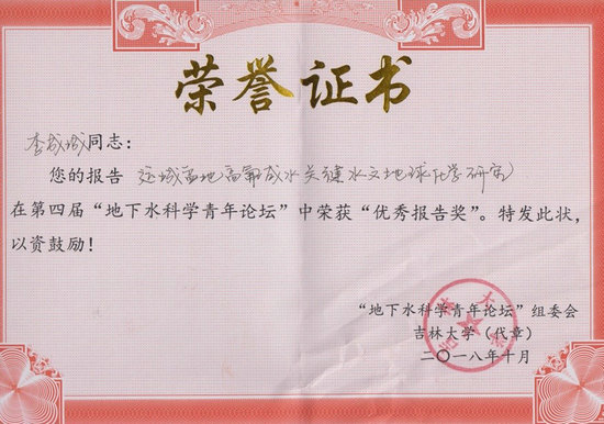 (环境学院张学海)近日获悉,我院环境科学与工程博士后流动站李成城博士后的“运城盆地高氟咸水关键水文地球化学过程研究”学术报告获得第四届“地下水科学青年论坛”优秀报告奖。