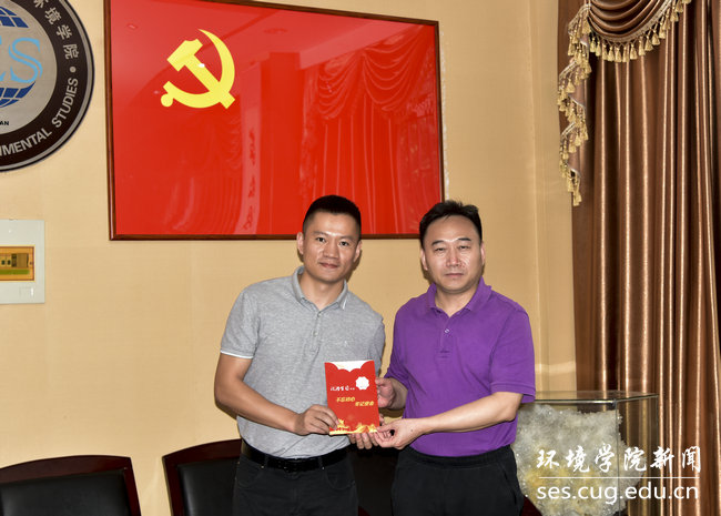 院直党支部成员、环境学院党委书记李素矿和院直党支部书记张学海分别为“政治生日”在六月份的补建伟、杨涛两位同志颁发“政治生日”纪念卡。