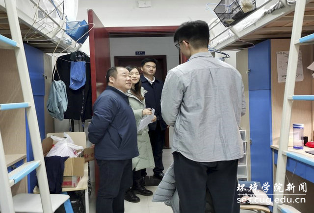 下午,党委副书记姜明敏,学工组辅导员等走访学生宿舍,对环境学院学生宿舍进行全面检查,逐个核实留校学生情况,提前送上新春祝福,叮嘱留校同学安全注意事项。