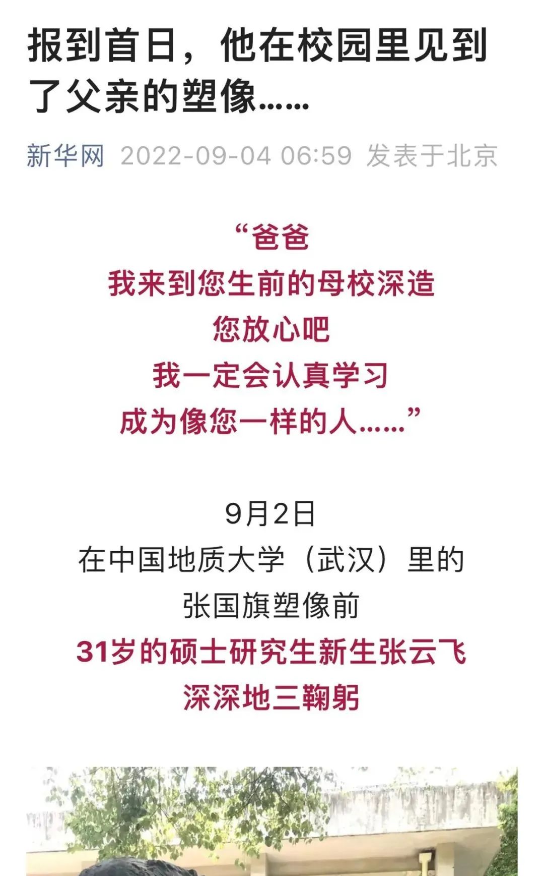 9月2日,中国地质大学(武汉)新生开学季,在报到的新生群体中,一名31岁的硕士研究生新生,在校园内的一尊雕像前,深深地三鞠躬后,默默地说道:“爸爸,我来到您生前的母校深造,您放心吧,我一定会认真学习,成为像您一样的人……”