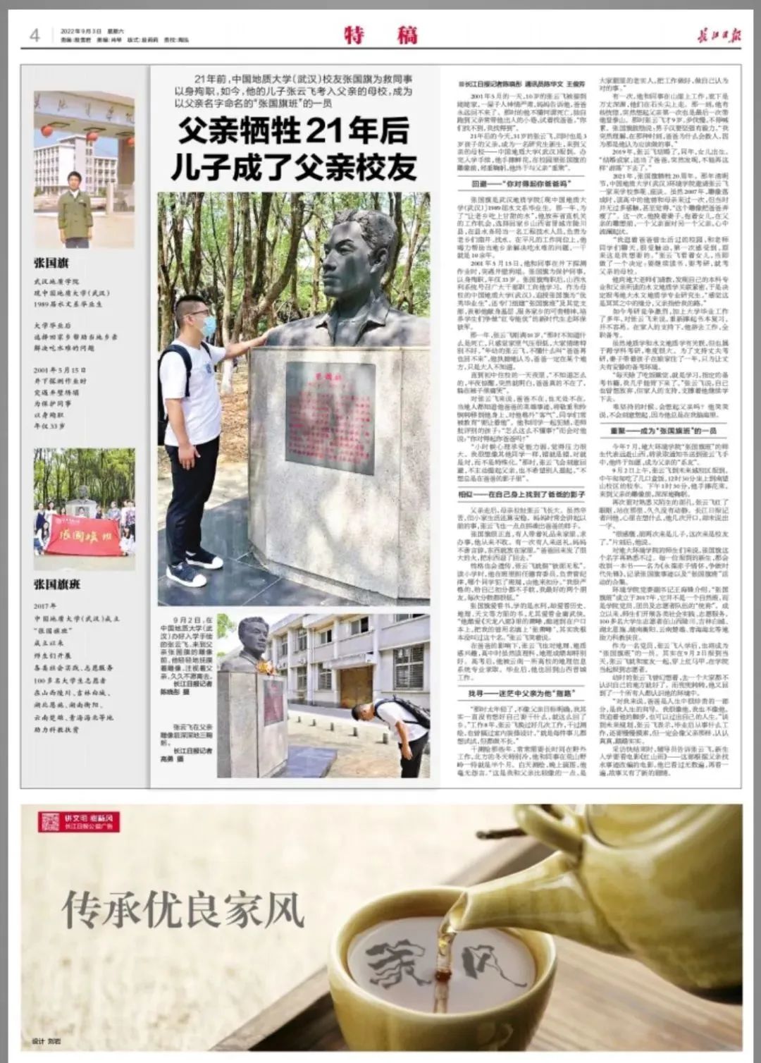 在中国地质大学(武汉)即将迎来70周年校庆前夕,9月2日是该校的新生开学季,英雄校友张国旗之子张云飞,大学毕业工作八年后,已经31岁的他,接过父亲的水文地质学接力棒,来校报到攻读硕士研究生。党委宣传部记者根据新闻线索,进行深入挖掘和采访,撰写长篇新闻通讯,全文如下: