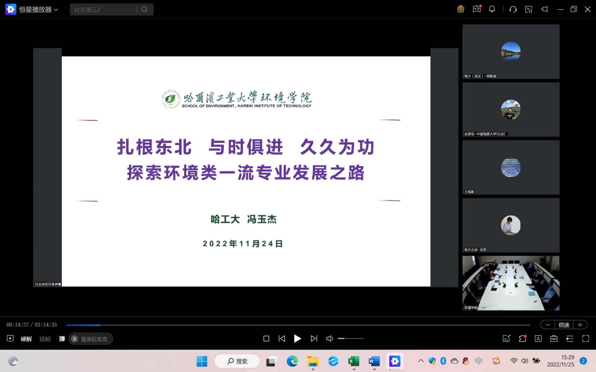(通讯员杨涛 邢新丽 编辑张学海)应环境学院院长史建波教授邀请,11月24日,哈尔滨工业大学冯玉杰教授以《扎根东北与时俱进久久为功探索环境类一流专业发展之路》为题线上作学术报告。该报告是我校校庆七十周年系列学术报告活动之一,柴波教授主持报告会。