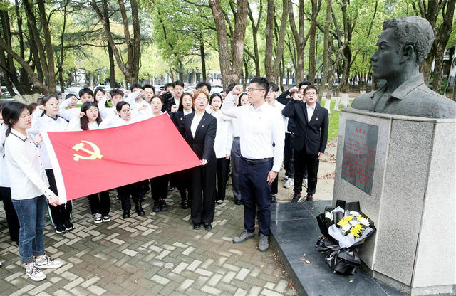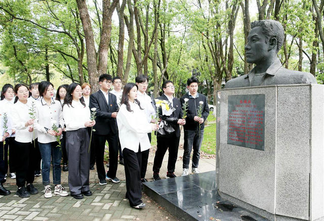 4月5日清明节,中国地质大学(武汉)环境学院师生青年党员,来到英雄张国旗雕像前重温入党誓词、向英雄敬献鲜花、擦拭英雄雕像,以缅怀英雄,传承先辈用专业知识回报社会、全心全意为人民服务的无私奉献的奋斗敬业精神。张国旗是地质大学学子,2001年5月15日,在山西省太行山区干旱地区为村民解决缺水难问题,以身殉职,其事迹原型拍摄成电影《红山雨》。 (湖北日报全媒记者张鸿 通讯员屠傲凌 王海锋 摄)