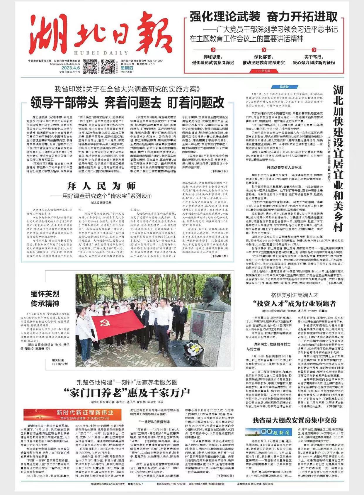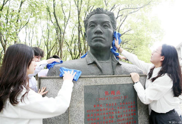 4月5日清明节,中国地质大学(武汉)环境学院师生青年党员,来到英雄张国旗雕像前重温入党誓词、向英雄敬献鲜花、擦拭英雄雕像,以缅怀英雄,传承先辈用专业知识回报社会、全心全意为人民服务的无私奉献的奋斗敬业精神。张国旗是地质大学学子,2001年5月15日,在山西省太行山区干旱地区为村民解决缺水难问题,以身殉职,其事迹原型拍摄成电影《红山雨》。