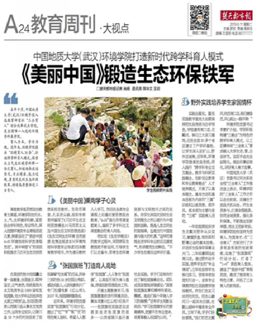 实践是延伸的课堂,是立德树人和学生践行知行合一的必经之路,也是习近平生态文明思想进头脑的落脚点。环境学院依托北戴河、周口店、秭归、巴东四大野外教学实习基地和科研课题研究流域地,广泛开展社会实践和社会调查活动,积极开展以基本概念、基本方法和基本技能为内容的“三基”训练和以练思想、练作风、练本领为主要内容的“三练”实践育人活动,将课程思政从课堂延伸到实践教学一线。学院在全国20多个省区建立产学研基地,让学生深入到矿山、野外区域等提升专业本领,培养专业情怀。每年一册的《师生野外实习风采展》,生动记录和展现了环境学生行走在山水林田湖草沙间躬行的身影。学生走进社区、中小学校开展习近平生态文明宣讲,溯江而上奔赴长江源科考一线,在实践中不断擦亮新时代大学生社会主义生态文明观的底色,把论文写在祖国大地上。