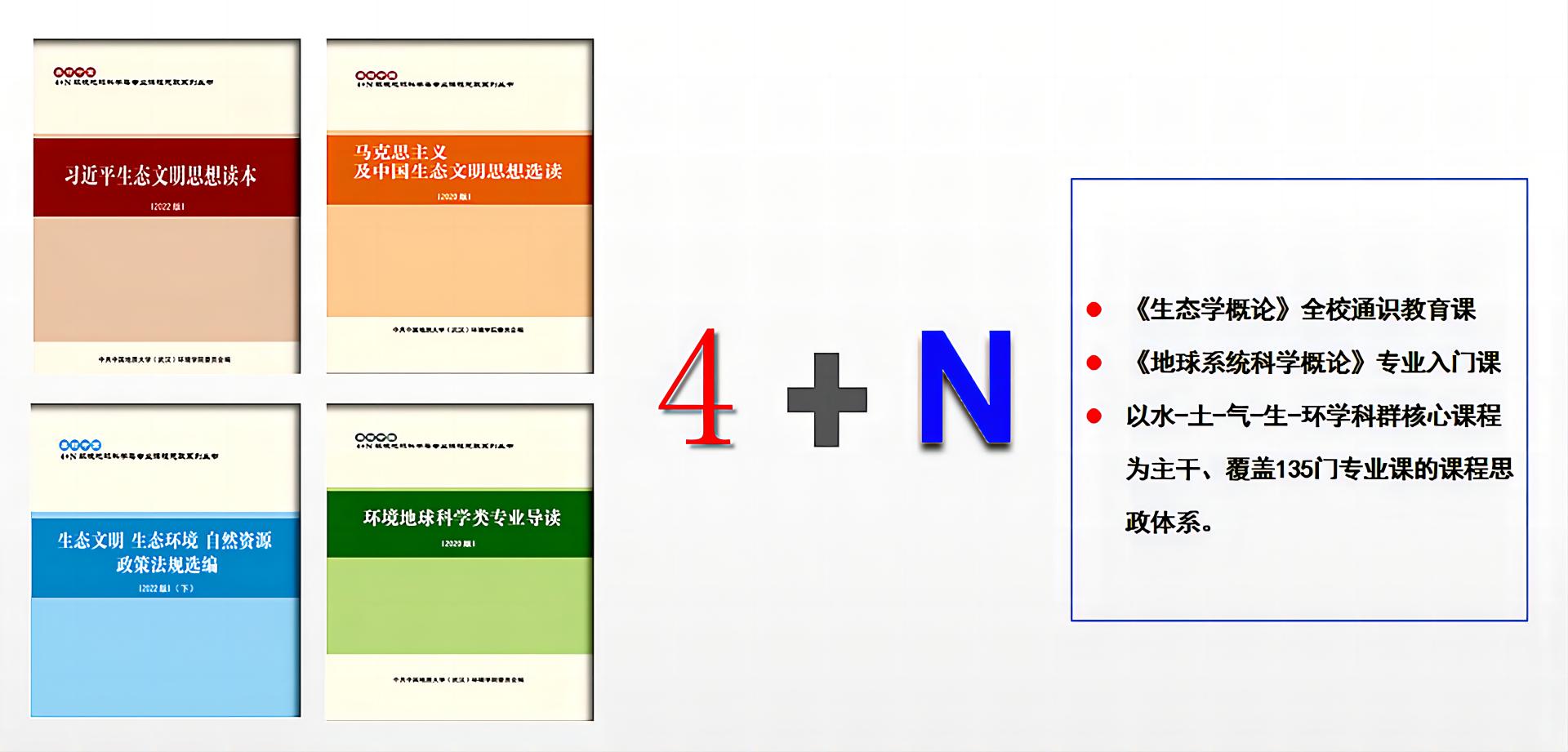 2018年始,环境学院成立美丽中国课程思政研究中心,结合学科特点、专业特色和教育教学规律、人才成长成才规律,组织师生编写《习近平生态文明思想读本》《马克思主义及中国生态文明思想选读》《生态文明 生态环境 自然资源 政策法规选编》《环境地球科学类专业导读》四本课程思政教材。其中,《习近平生态文明思想读本》涵盖习近平生态文明思想的生态兴则文明兴、生态衰则文明衰的深邃历史观、人与自然和谐共生的科学自然观、绿水青山就是金山银山的绿色发展观、良好生态环境是最普惠的民生福祉的基本民生观、山水林田湖草沙是生命共同体的整体系统观、用最严格制度保护生态环境的严密法治观、全社会共同建设美丽中国的全民行动观、共谋全球生态文明建设的全球共赢观八个部分。校党委书记黄晓玫为该丛书作序。该系列教材先后修编2次在全校大学生使用,《习近平生态文明思想读本》(中英文版)在留学生中掀起学习热潮。同时在兄弟高校大学生、地大附校等中小学生中传播。