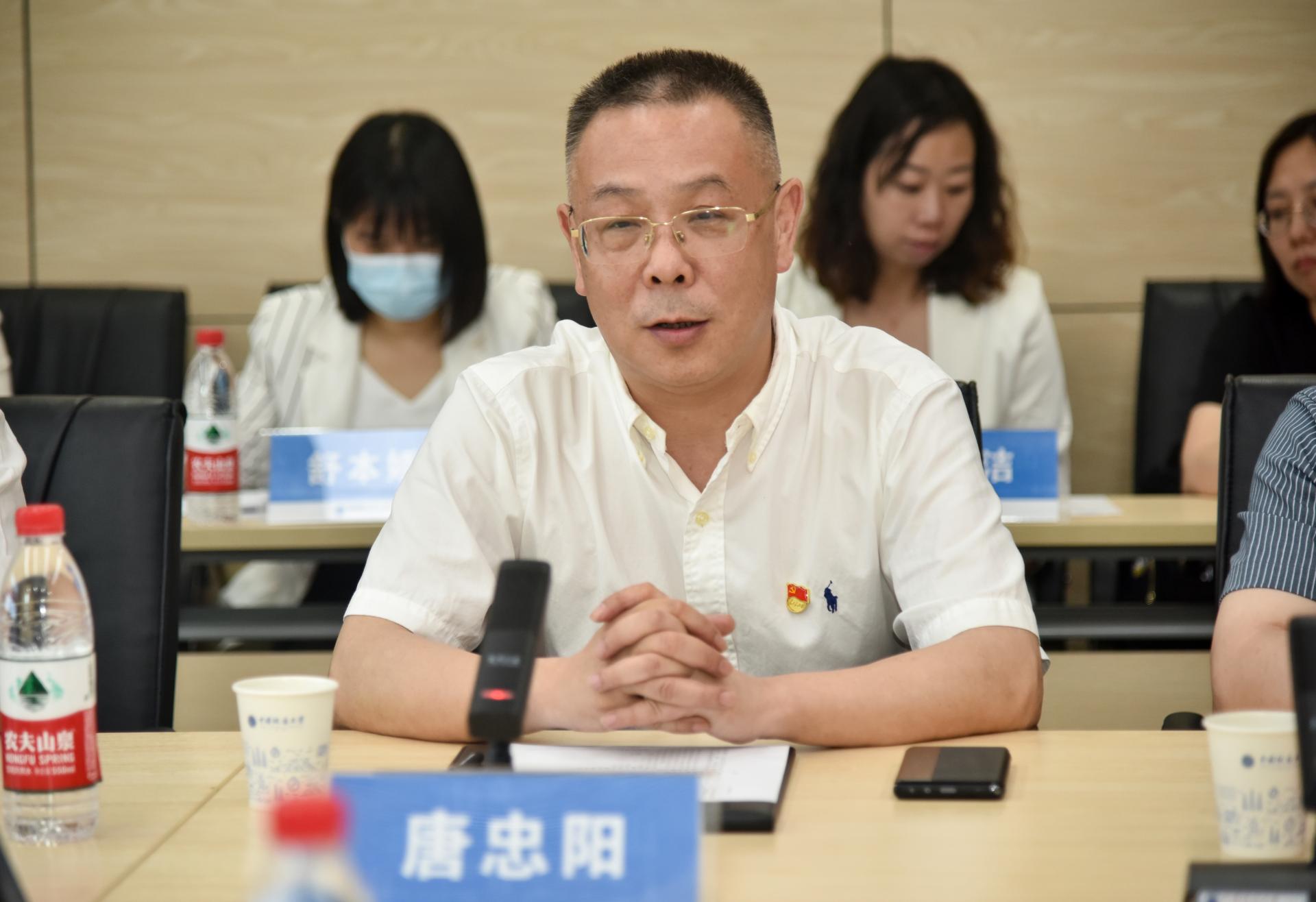 唐忠阳致辞,他对武汉职业技术学院一行来访表示热烈欢迎。他表示,环境学院党建“双创”亮点突出、成效显著,以高质量党建引领事业高质量发展。如今,我们以扎实开展学习贯彻习近平新时代中国特色社会主义思想主题教育和深入开展调查研究工作为契机,通过组织互建、党员互动、活动互联、经验互鉴,共同促进高校党建工作提质增效。未来要继续加强互学互鉴、互联互通,推动主题教育走深走实、取得实效。