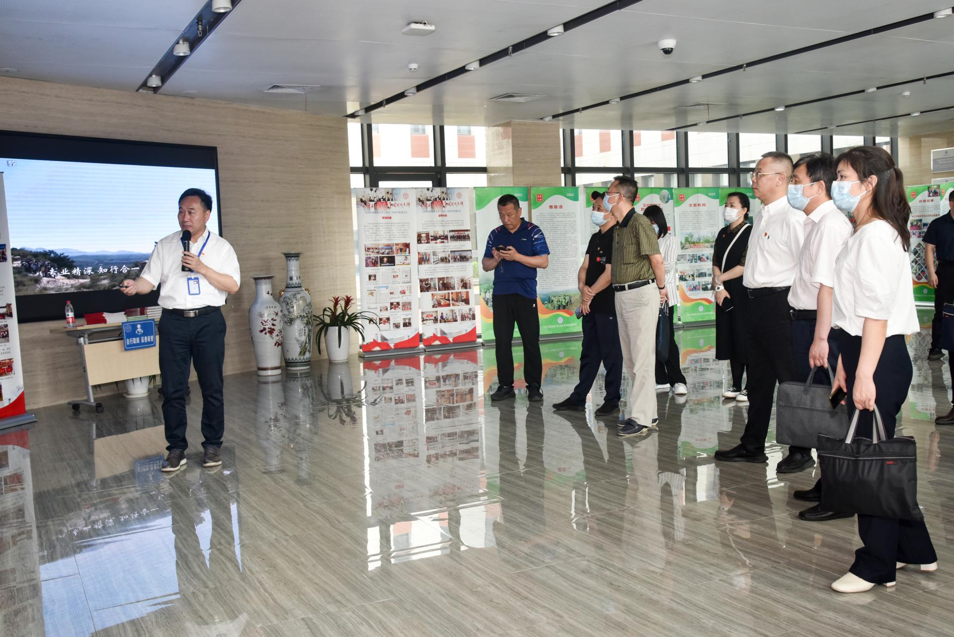 与会人员集体参观以英雄榜样人物命名的全国党建工作样板支部成果展板及环境学院党建“双创”工作成果展板,李素矿介绍了以英雄榜样人物命名的全国党建工作样板支部基本概况和建设成果,重点讲解了环境学院基本概况、党建工作体系、三全育人改革、跨学科教育研究、张国旗班行动计划、“4+N”美丽中国课程思政、“1+6”党建资政育人载体、兄弟院校交流互鉴、领导关怀指导和社会媒体反响等十个方面,全面反映了学院党委近年来党建示范创建和质量创优工作取得的创新性理论成果、制度成果、实践成果和特色成果,是环境人干事创业、追求卓越的汗水结晶。