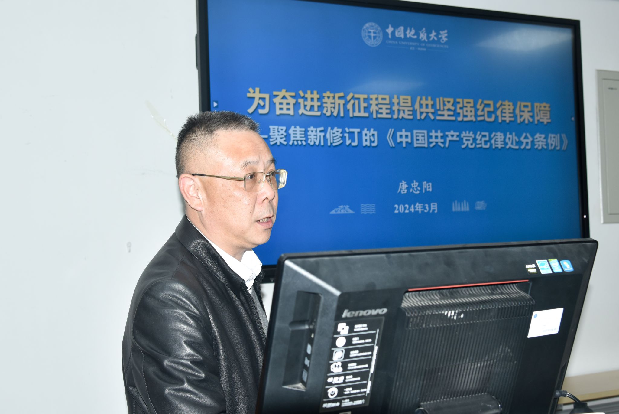 (通讯员/编辑何娟 摄影张学海)2024年3月26日上午在科教楼四347报告厅,校党委副书记、纪委书记唐忠阳以“为奋进新征程提供坚强纪律保障——聚焦新修订的《中国共产党纪律处分条例》”为题,为环境学院师生讲专题党课。环境学院领导班子成员,三级单位班子成员、院直全体党员,全体师生党支部书记、支部委员等参加学习。