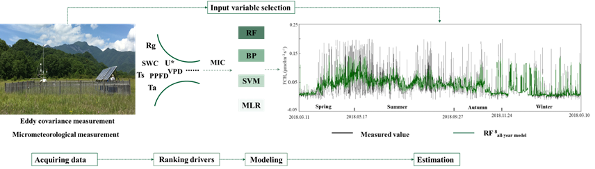 结果表明:(1)最大信息系数技术(MIC)能够识别与甲烷通量相关性较强的环境变量。(2)土壤温度、土壤含水量和空气温度是影响甲烷通量的主要环境因素。(3)基于随机森林算法(RF)的模型表现出比其他模型更好的性能。