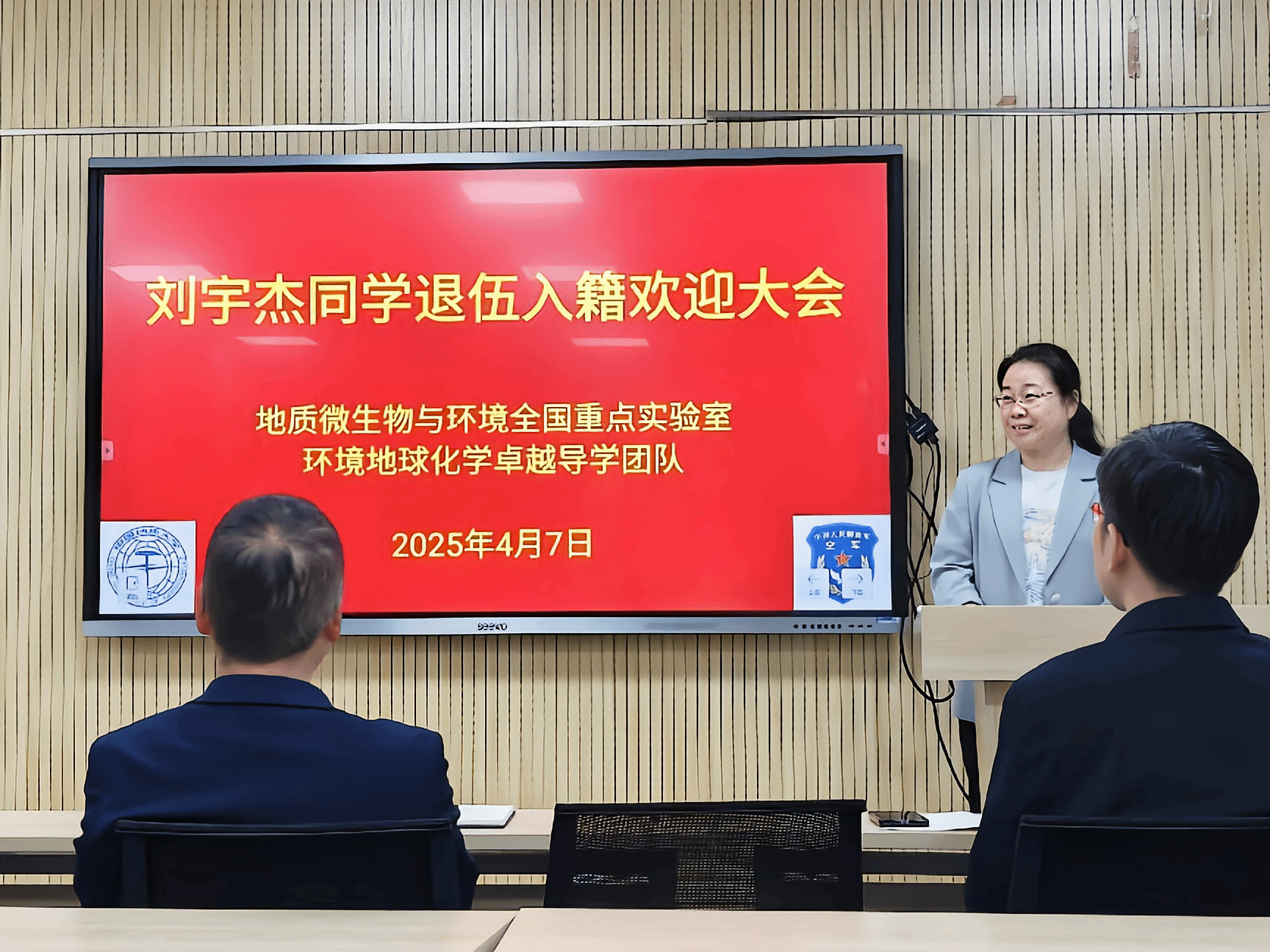 侯建湘代表地质微生物与环境全国重点实验室对刘宇杰退伍返校表示热烈欢迎,希望他能将军营中的精神带入到学术研究中,实验室也将为所有师生提供优良学习科研环境,期待同学们在未来的学习中继续发扬优良传统,争取更大的成就。