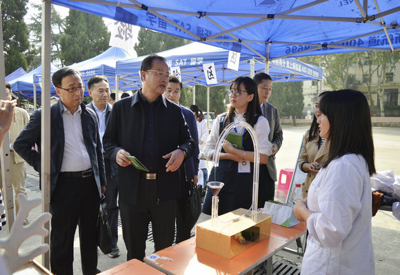 校党委书记何光彩,教务处、学工处、研工部、校团委等部门负责人,环境学院党委书记李素矿、院长马腾,副院长祁士华、王红梅、郭会荣,党委副书记朱继,辅导员、学生代表等一同参观科普展区。