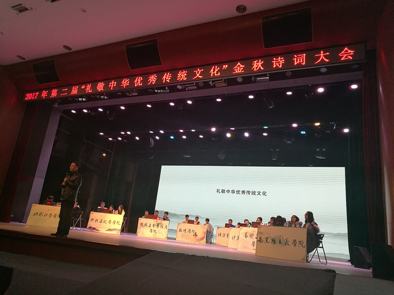 2017年12月8日,由党委学生工作部、党委研究生工作部、教务处、校团委联合举办的第二届“礼敬中华优秀传统文化”金秋诗词大会在弘毅堂顺利举行。我院付昱钢、刘恩俊、李凡三位同学精心准备,经笔试,小试牛刀初登场、百尺竿头斗志昂、精彩飞花我最强等四个环节等环节后,从全校20余个单位派出的参赛队伍中脱颖而出,荣获第二名。
