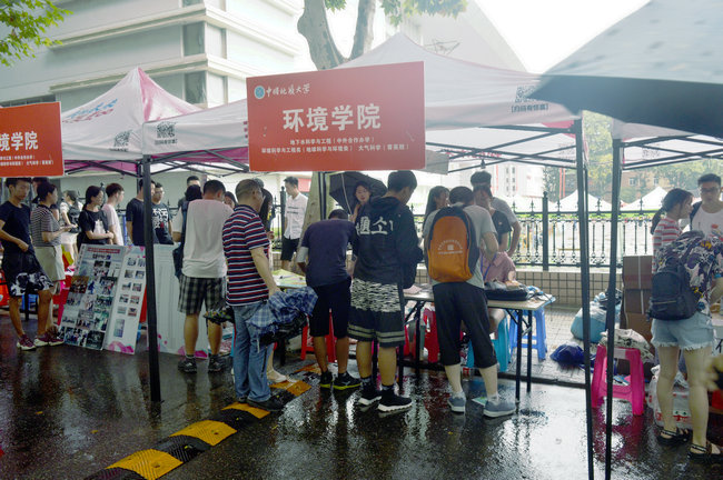 迎新第一天下起了大雨,但丝毫没有影响同学们的服务热情。团委学生会与志愿者分工合作,分别在体育馆前和迎新棚等待新生到来。体育馆前的志愿者负责举牌将新生带到迎新棚处,由迎新点的志愿者引导新生报名注册、关注学院公众号以及发放学院准备的院刊、野外实习风采展等新生礼品,然后由机动小组带领新生前往寝室安排休息。同时迎新棚内还设有家长休息点,方便家长询问、休息。