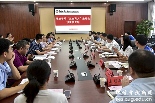 (通讯员 李平、张浔 摄影 耿婧 编辑 陈杰)2019年6月28日上午,环境学院“三全育人”推进会——班主任专题工作会议在教学综合楼A701举行。校党委常委、副校长刘杰,教务处处长周建伟,学工处副处长苏洪涛,校团委副书记朱荆萨,党委宣传部思政科许小康,环境学院党委书记李素矿,副院长柴波、谢先军,党委副书记姜明敏,学院本科生班主任、学务指导老师、学工组、教务科老师等30余人参加会议。