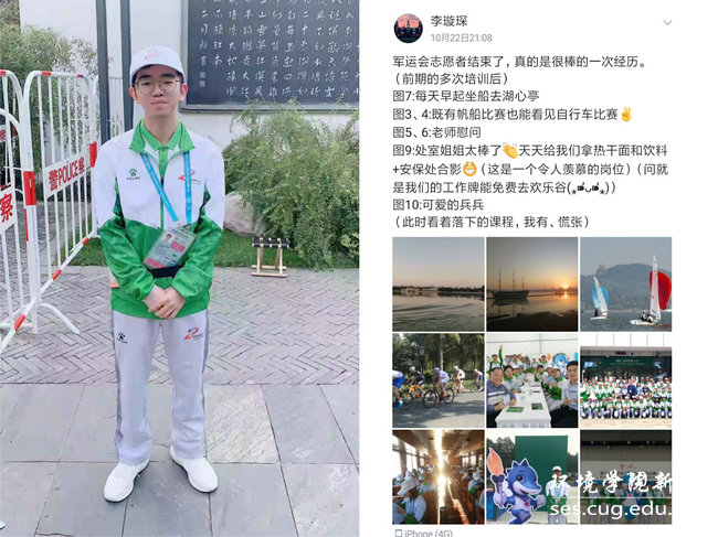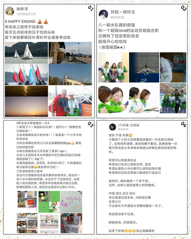 来自环境学院的竞赛组织处志愿者组长、1 7级大气科学专业的林凡分享了自己的志愿服务体会,她说:“参加了这次军运会志愿者活动,并担任竞赛组织处湖心岛区域的负责人,让我知道了如何与同学相处,如何带领好团队,亲身体会到了志愿服务是奉献社会,服务他人的一项工作,是传播爱心,播种文明的过程!”