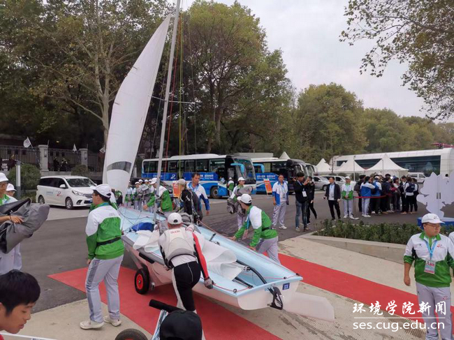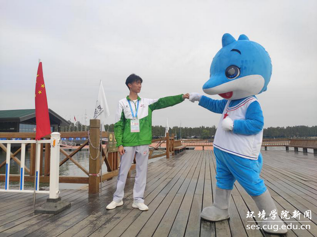 观众服务处的吉祥物“兵兵”扮演者中有两位是环境学院的“小水杉”——17级大气科学专业的哈斯朝鲁和18级水文与水资源工程专业庄胜杰,他们每天在闷热厚重的卡通服里向各位路过的来宾、运动员、工作人员和志愿者挥手打招呼,蹦蹦跳跳成为了帆船赛场上一抹可爱而亮丽的色彩。