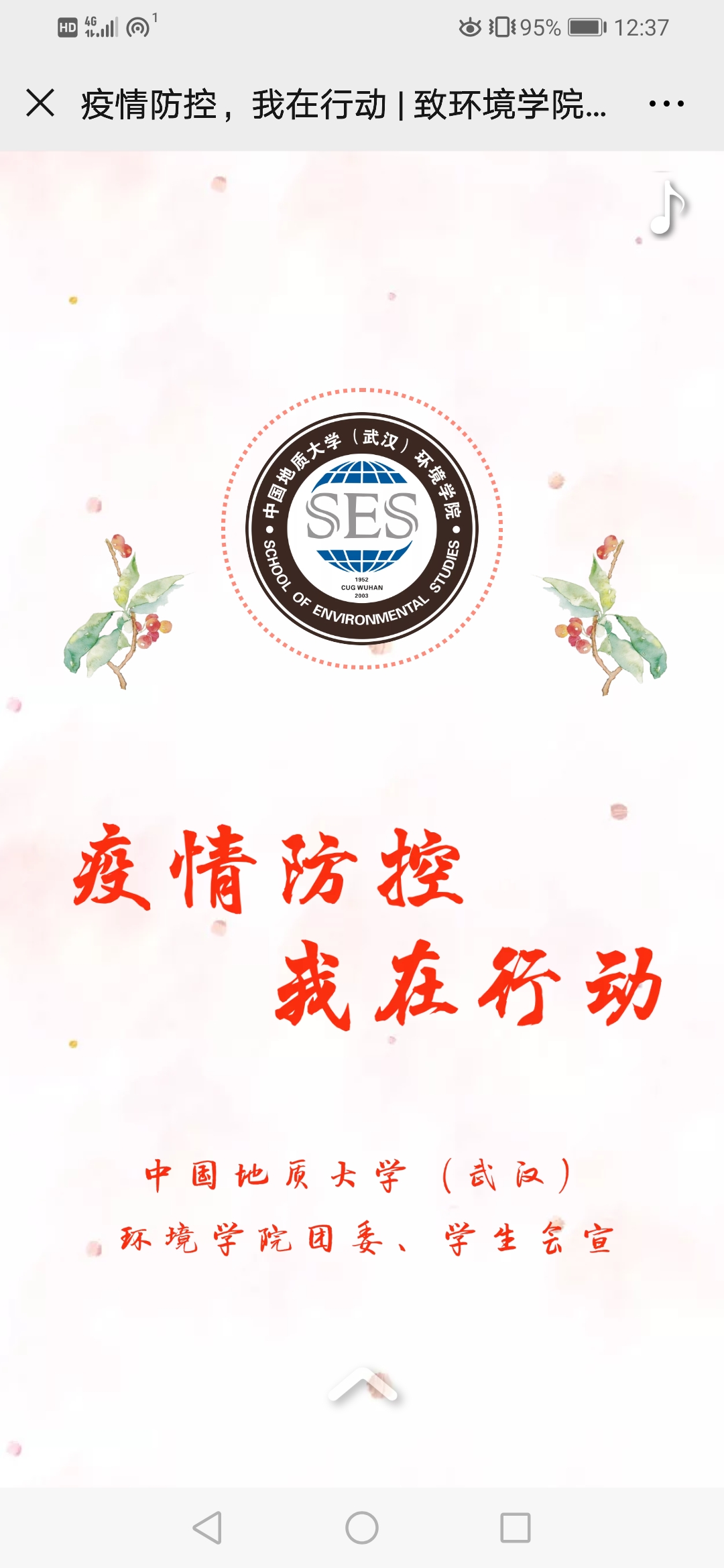 九州同忾战疫情,春暖花开终有时。党建领航、团结一心、班级守底,环境学院全体师生与全国人民一道,和衷共济、共克时艰,发挥“金字塔”组织体系效能,推进基层学生疫情防控工作,形成环境学子生态环保铁军合力,为武汉加油、为湖北加油、为中国加油!