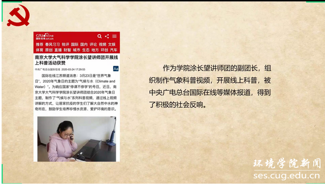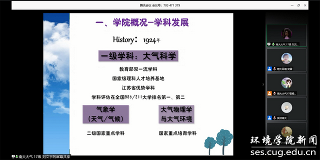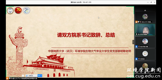 (通讯员宋霖、李晴 编辑耿婧)2020年5月23日周六上午十点,中国地质大学(武汉)环境学院生物大气专业大学生党支部与南京大学大气科学学院本科生党支部通过腾讯会议举行了一场别开生面的云共建活动。南京大学大气科学学院党委副书记喻春红、辅导员吴沫,中国地质大学(武汉)环境学院党委副书记姜明敏、党建辅导员宋霖,以及两个党支部的全体学生党员参与此次云共建活动。