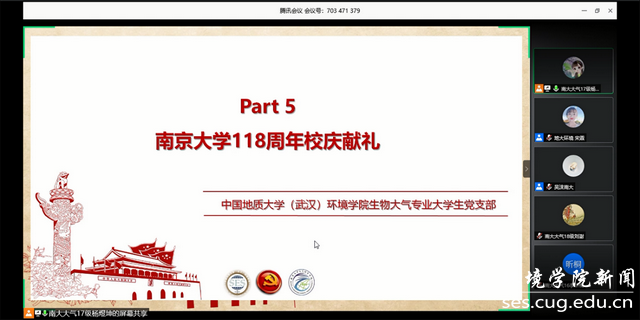 活动第五项,中国地质大学(武汉)为南京大学118周年校庆献礼,生物大气党支部全体成员打开摄像头,向他们表示了最真诚的祝愿:中国地质大学(武汉)环境学院生物大气专业大学生党支部全体祝南京大学118周年校庆生日快乐,繁荣昌盛,再谱华章。生物大气党支部党员王立诚说:值此南京大学成立118周年之际,祝福南京大学生日快乐。大江之东,金城之中,天开教泽,道启南雍。自1902年以来,回望历史,南京大学总是宏大而光辉的,嚼得菜根做的大事为这所大学奠定了百年基调。去年十一月也有幸去南京大学鼓楼校区游玩,绿茵蓝天的衬托下,北大楼的身姿愈发青葱,布满爬山虎的藤蔓有种淡雅祥和的气息,和“中国最温和的大学”之称莫名契合。忠于使命,勇于担当,如日之升,如月之恒,最后,祝愿南京大学再创辉煌!