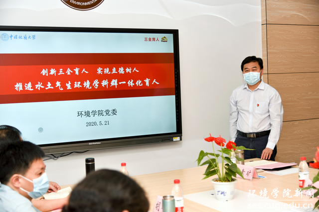 学院党委书记李素矿以《创新三全育人,实现立德树人,推进水土气生环境学科群一体化育人》为题,从“1场战‘疫’——检验‘三全育人’实效标尺”“3项举措——探索‘美丽中国’课程思政、实施‘张国旗班’行动计划、打造‘1+6’资政育人载体”“4点体会——坚持党建引领‘三全育人’、谋划‘三全育人’工作方案、筑牢立德树人‘铁打营盘’、创新‘三全育人’成果宣传”“4点思考——深化‘三全育人’路径措施”四个方面汇报了我院“三全育人”综合改革试点工作进展情况和阶段性创新成果。他表示,学院党委下一步将克服疫情影响,统筹教育教学发展和试点改革工作,持续深化知识传授、能力培养与价值引领有机融合,高质量打造特色一体化育人体系和新时代高校思想政治教育新样板。