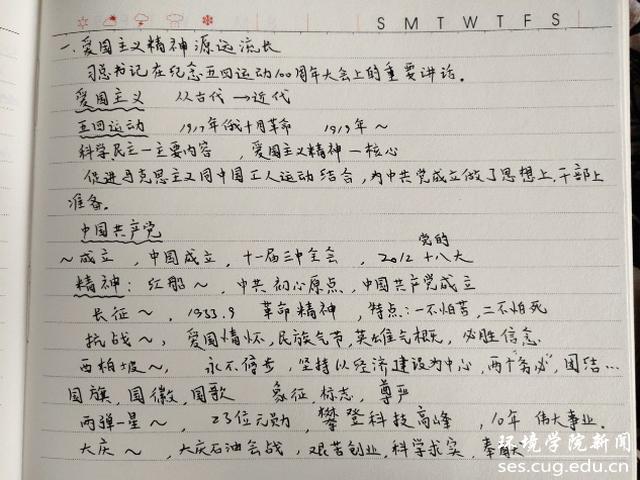 045171班张子茵表示,我们要向优秀的地大人学习,要扎根基层,扎根人民,奉献国家,把爱国精神转化为强国报国的自觉行动。在实践中谨记时代赋予青年的众望和嘱托,要努力投身于建设美丽中国的伟大事业中,能够利用专业知识为国家建设贡献自己的力量。