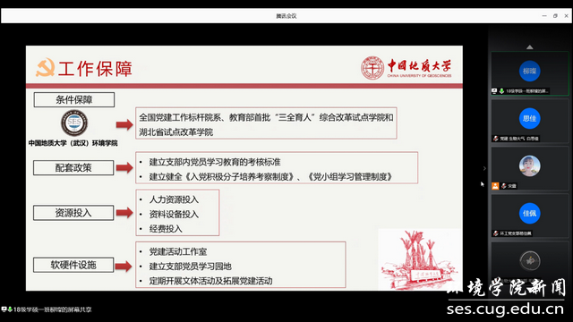 (通讯稿宋霖 编辑耿婧)为深入贯彻党的十九大精神和习近平新时代中国特色社会主义思想,推进样板支部培育创建和高校双百创建工作,6月19日上午,环境学院全体非毕业年级党支部委员及学生党员代表通过腾讯会议室以“党旗飘扬 党建领航”为主题召开学生样板党支部培育创建暨环境学院第七届党支部风采大赛。学院党委书记李素矿、党委组织部副部长冷再心、党委学工部副部长蒋怀柳、学院党委副书记姜明敏、学工处思政办主任徐伟、学工处思政办副主任熊程应邀参加会议,学院党建辅导员宋霖主持会议。