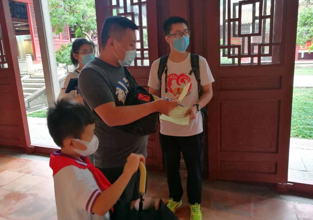 实践团成员学习参观展馆陈列,同时与游客交流并邀请填写问卷。家长带着孩子参观时,一边给孩子作讲解。“我们今天有这样的生活,都是这些先辈们干革命、打天下,经过很多努力和牺牲得来的……”