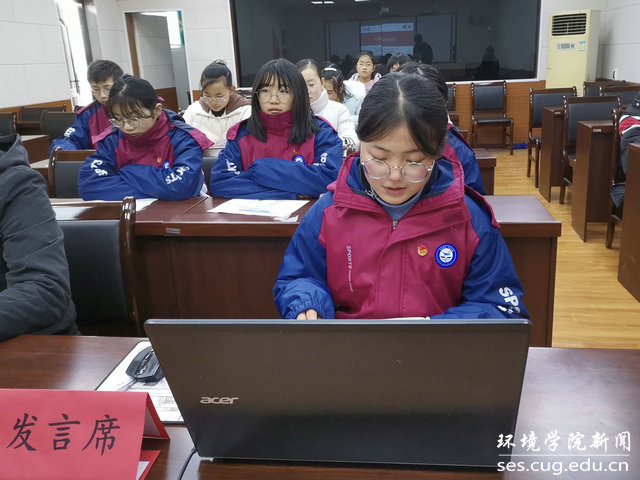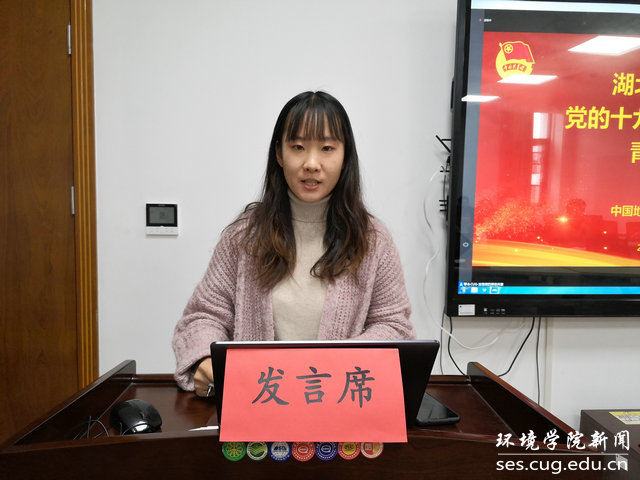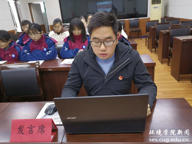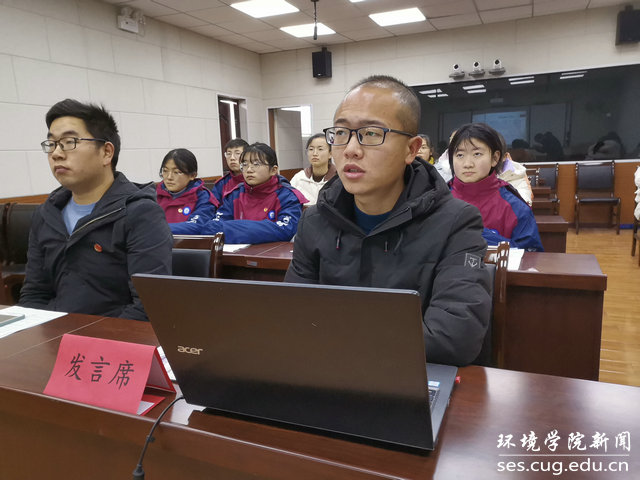 水文专业大学生党支部书记刘傲介绍党支部发展情况。他说,水文支部在环境学院党委的正确领导下,致力打造“双创”品牌,在支部党员思想学习、成长发展、科研能力、实践服务等方面实现引领作用:支部曾邀请华中科技大学先进学生党支部,来院介绍典型经验;与教师党支部共同参观中共五大会址,加强师生党建交流;组织支部成员进行咀里湖志愿清扫活动;成立党员帮扶小组,让优秀同志帮扶成绩薄弱同学;学院搬迁期间,组建义务搬迁工作队,帮助女同学搬运行李。最终,在支部成员的共同努力下,支部今年获评校“十佳党支部”。