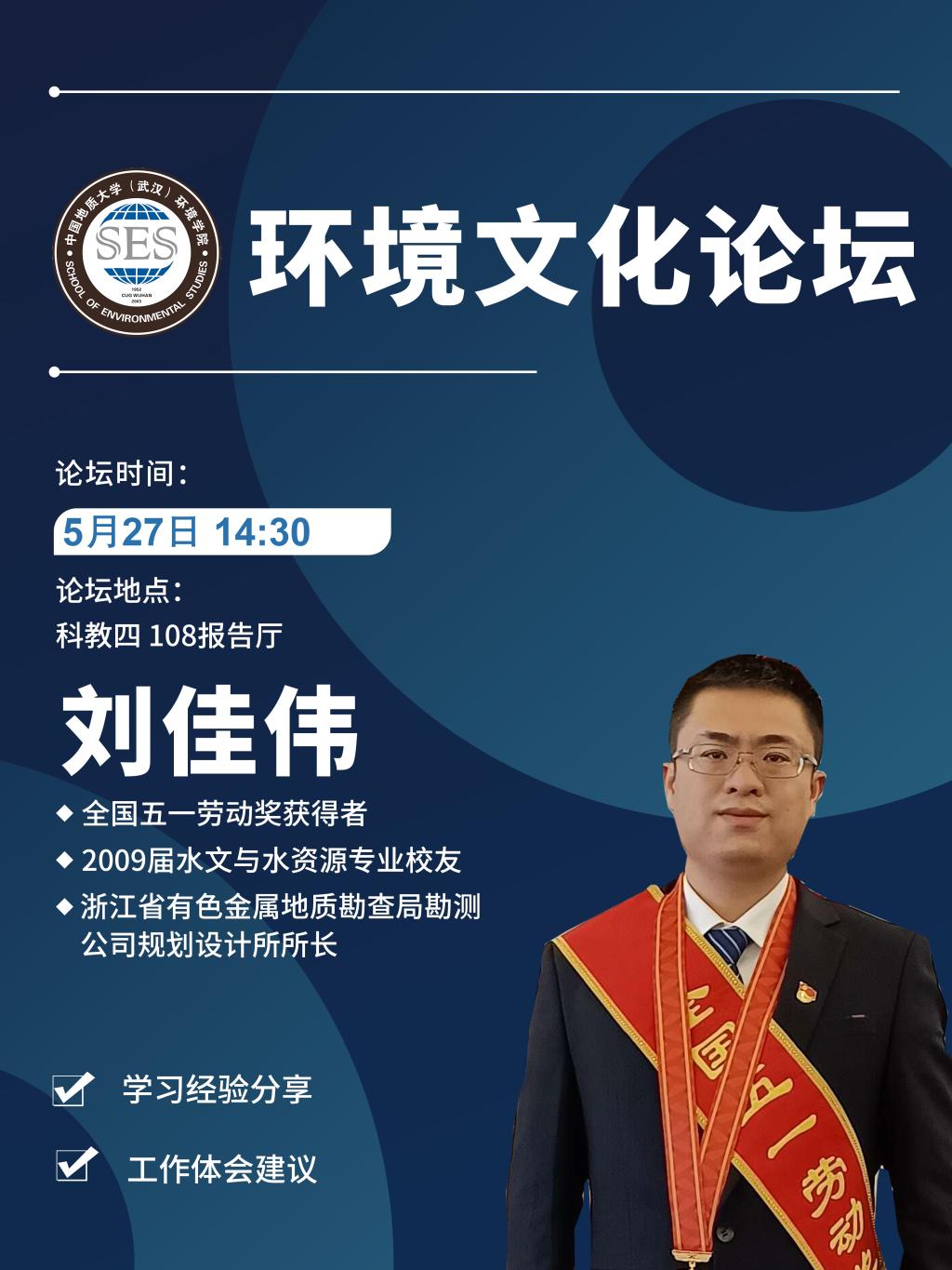 在2021年庆祝“五一”国际劳动节暨“建功‘十四五’、奋进新征程”主题劳动和技能竞赛动员大会中,我院3位校友荣获“全国五一劳动奖章”。本期环境文化论坛,我们诚挚邀请了获奖者之一、来自我院2009届水文与水资源工程专业的刘佳伟校友出席并为同学们分享学习和工作经验。