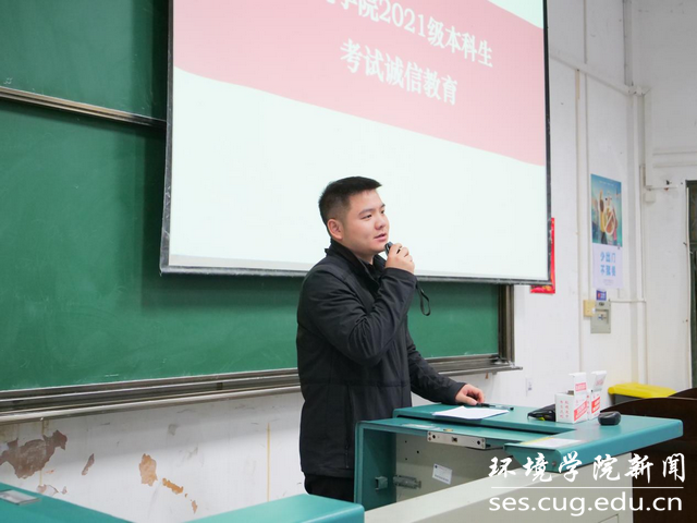 会议第二项,辅导员陈俊男以“知标晓纪,牢记红线”为主题,对全体同学进行诚信考试教育。他向全体学生说明诚信考试的重要性以及考风考纪的具体要求,逐字逐句地解读《中国地质大学(武汉)本科课程考核违规处理办法》中对于考试违纪行为的认定与处理,向同学们强调了考试作弊的严重后果,要求大家严格遵守学校的纪律规定,诚信考试。