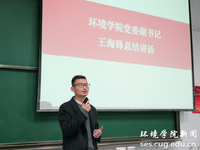 会议最后一项,王海锋副书记从“为什么读大学?为什么来地大?为什么在这里听课?”的问题引入,以“珍惜时光,主动作为,沉淀积累,厚积薄发”为题目,进行学生成长与发展主题教育。一是介绍了“底线”和“发展线”概念,通过以往学生案例,勉励大家守牢底线,向优秀学生看齐。二是号召同学们充分发挥好本科生导师制的作用,利用好环境学院的学科和专业优势,主动融入研究型学院发展大局,成为德智体美劳全面发展的社会主义建设者和接班人。三是结合自身成长经历,引导同学们主动适应大学的学习生活,珍惜时光、主动作为,实现“内驱型成长”。四是通过引用地大校友温家宝2012年回母校的讲话,鼓励大家发扬艰苦朴素、求真务实的校训精神,沉淀积累、厚积薄发,培养艰苦奋斗的素质和独立思考的能力。五是引用《习近平的七年知青岁月》和《温家宝地质笔记》两本书的内容,引导同学们要立大志、明大德、成大才、担大任,努力成为堪当民族复兴重任的时代新人。