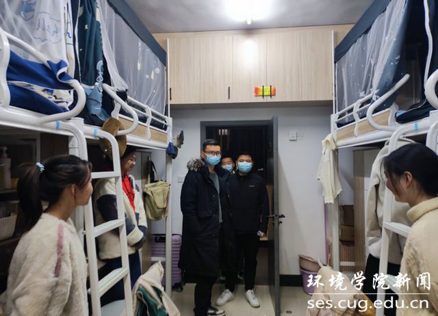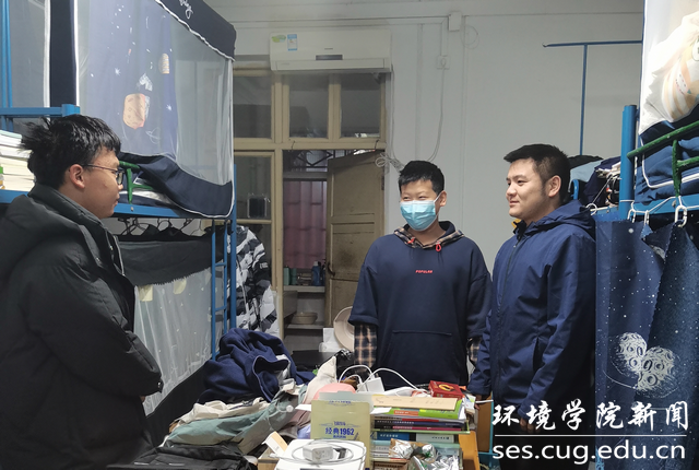 (通讯员陈俊男 摄影耿子涵 编辑耿婧)12月10日-11日,环境学院党委副书记王海锋带领学工组全体专兼职辅导员走访学生宿舍,看望南望山校区和未来城校区学生,他们与学生亲切交谈,了解同学们学习生活情况,期末考试复习备考情况和宿舍卫生状况,了解学生对学校当前防控政策的意见和建议,强调要坚持疫情防控不松懈,严守防控工作要求,不恐慌、不造谣、不传谣,并提醒大家冬季是传染病高发季节,严格落实“戴口罩、勤洗手、常通风、少聚集”等个人防护措施,养成良好的个人卫生习惯,如出现呕吐、发热、腹痛和腹泻等症状,不要隐瞒、及时上报各年级辅导员。