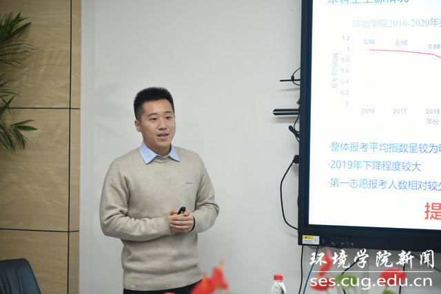 辅导员孟庆达做环境学院学生发展报告,汇报学院近五年学生发展情况。他从近五年学院学生总体现状、学习情况、党员发展情况以及升学就业情况分析学院学生发展情况。他建议打造全员育人共同体、汇聚“多维育人”动力源。加强各教育主体的协调联动,从导师、班主任和辅导员为着力点构建良性运转的全员育人协同机制。