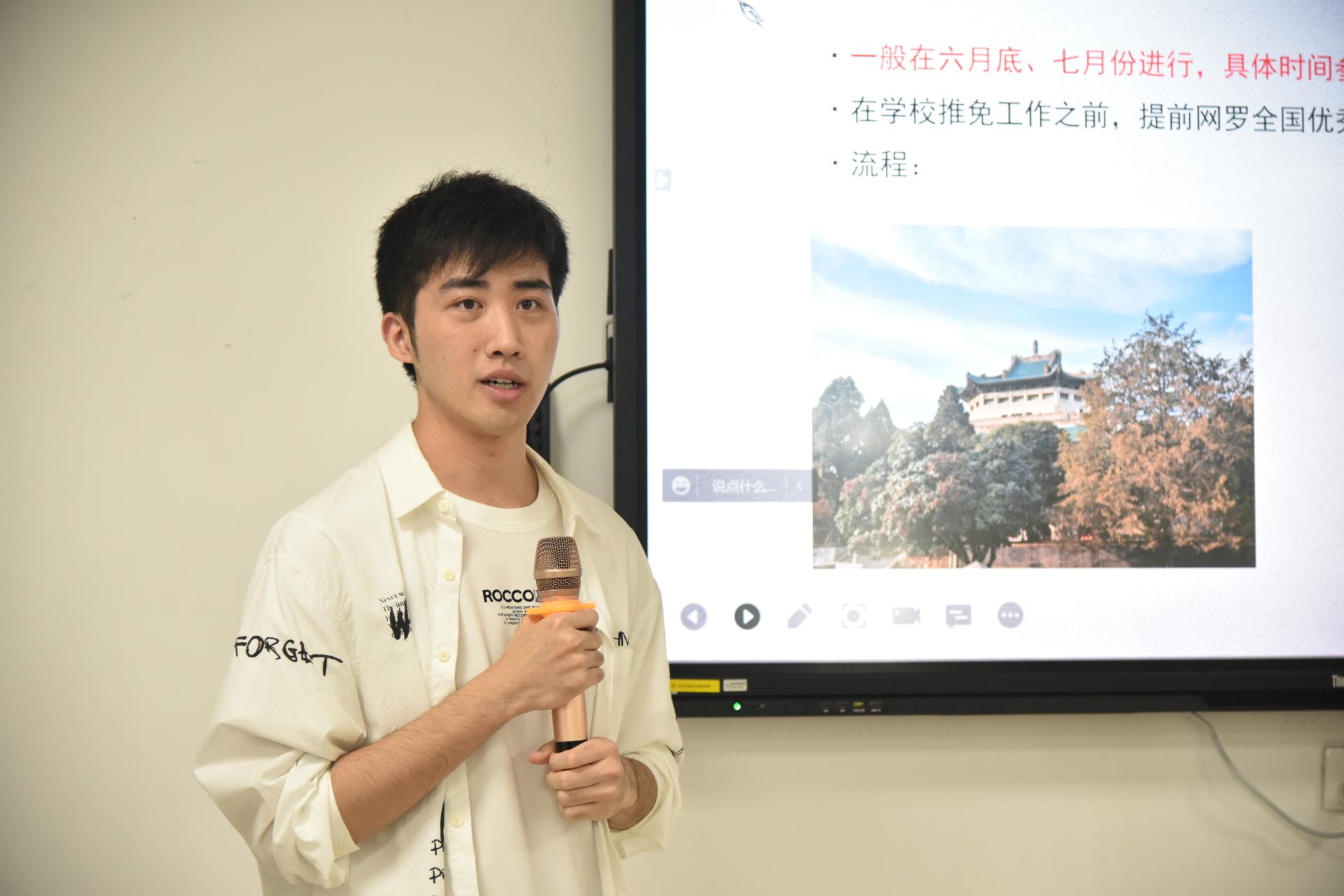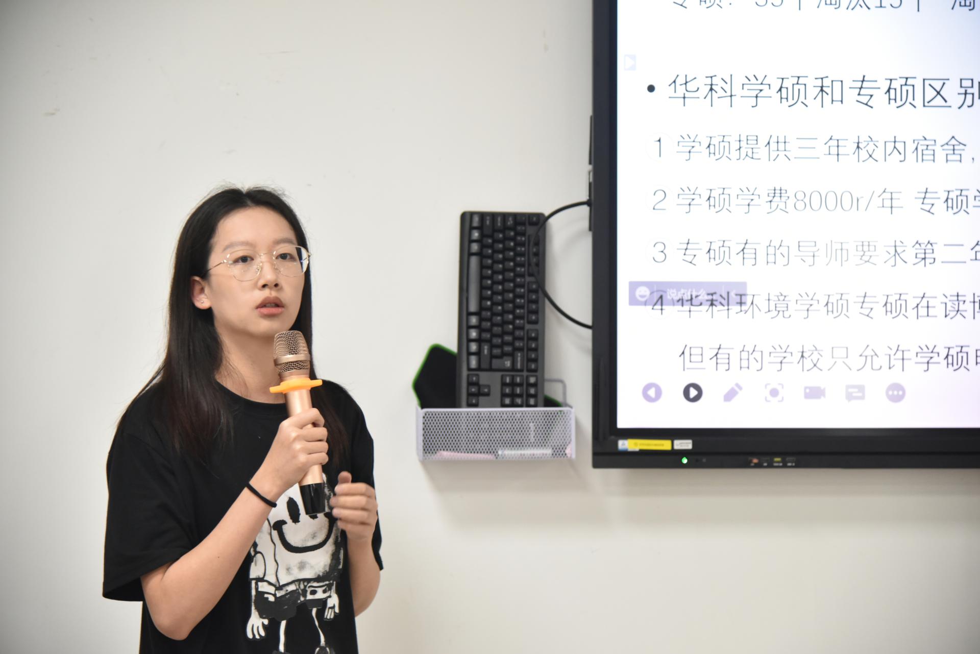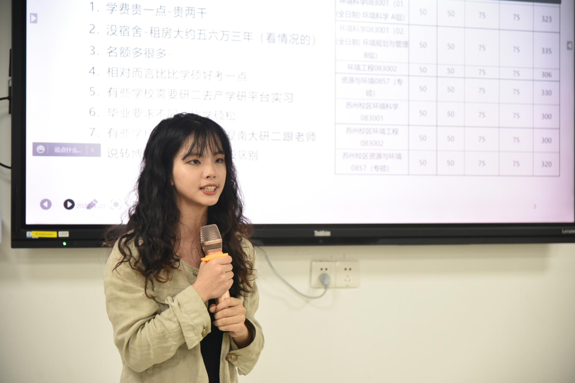 首先,2018级中加项目学生李宜伦以专业绩点排名第一的成绩获得保研推免至武汉大学水利水电学院,他从夏令营、预推免和正式推免三个阶段的流程,院校选择,联系导师,学院推免方案等方面进行了详尽的讲解,鼓励同学们尽早确定方向,找准自己的专业目标,努力提升自身水平和综合素质;贺沁文通过我校“本硕博”贯通培养计划获得保研推免资格,将攻读我院环境科学与工程专业(直博),他就计划介绍、参选条件、录取流程、前期流程等方面对该计划进行介绍,建议同学们慎重抉择,提前做好规划,尽早与导师取得联系,在保研之路上放平心态、张弛有度。