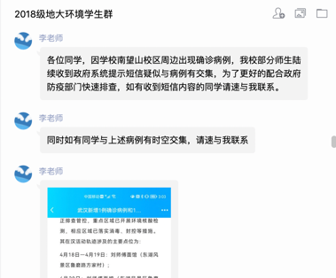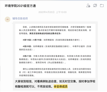 4月22日晚,随着“接属地疫情防控部门通知,立即排查4月19日以来学校周边区域过往人员”的排查通知传来,环境学院疫情阻击战吹响了冲锋号。一时间,学生们疑惑、恐慌、焦虑的情绪向辅导员袭来: