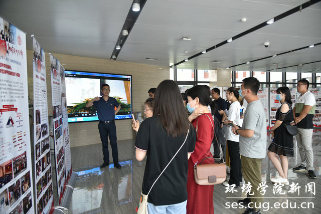 王海锋讲解环境学院党建“双创”工作成果展板。内容包括学院基本概况、党建工作体系、三全育人改革、跨学科教育研究、张国旗班行动计划、“4+N”美丽中国课程思政、“1+6”党建资政育人载体、兄弟院校交流互鉴、领导关怀指导和社会媒体反响等十个方面,全面反映了学院党委近年来党建示范创建和质量创优工作取得的创新性理论成果、制度成果、实践成果和特色成果,是环境人干事创业、追求卓越的汗水结晶。