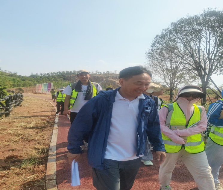 上午10点,李素矿一行同2021级环境科学与工程大类专业04H217班学生参加江夏矿山公园实习路线。他与同学们一起听取带班老师宁立波对土地复垦相关内容的讲解,了解江夏矿山公园如何开发成为一个旅游景区。他与实习学生展开亲切交谈,询问同学们的实习近况,认真倾听同学们的心得感悟。他表扬同学们在努力完成每日野外实习任务的同时,实地践行了“艰苦朴素,求真务实”的校训精神,彰显了新时代生态环保铁军的风采。他勉励同学们要重视野外实习实践,领会野外实习对专业的巩固和提高的重要性,要坚持理论与实践相统一,将书本上的理论知识运用于实践中,为生态文明建设和生态环境保护事业贡献一份力量。