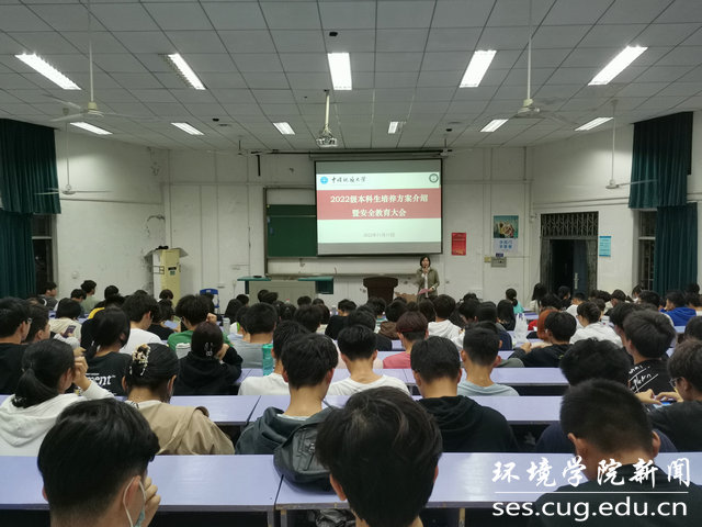 (通讯员刘闫旭、冯雪岚 摄影冯雪岚、刘闫旭 编辑耿婧)11月11日晚19:00,环境学院2022级本科生培养方案介绍暨安全教育大会在南望山校区教三楼207举行,安全保卫部副部长彭冠军,治安科魏景明老师,学院副院长柴波教授,辅导员李平及2022级全体本科生参加会议。
