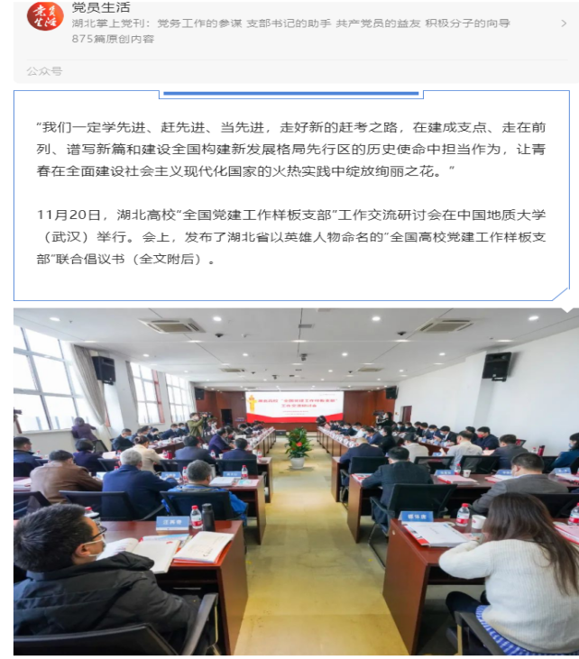 (通讯员陈俊男 摄影/编辑耿婧)为深入学习贯彻党的二十大精神,传承红色基因铸魂育人。通过交流研讨、联合倡议,充分展示湖北省以英雄人物命名的“全国高校党建工作样板支部”群星风采,创新推进全国高校党建工作样板支部在教育、管理、监督党员和组织、宣传、凝聚、服务群众中的示范引领效应。通过组织互建、党员互动、活动互联、经验互鉴,共同打造湖北高校全国党建工作样板支部特色品牌,彰显湖北高校全国党建工作样板支部群星效应,促进全省高校基层党建工作提质增效,达到示范创建、质量创优的目标。