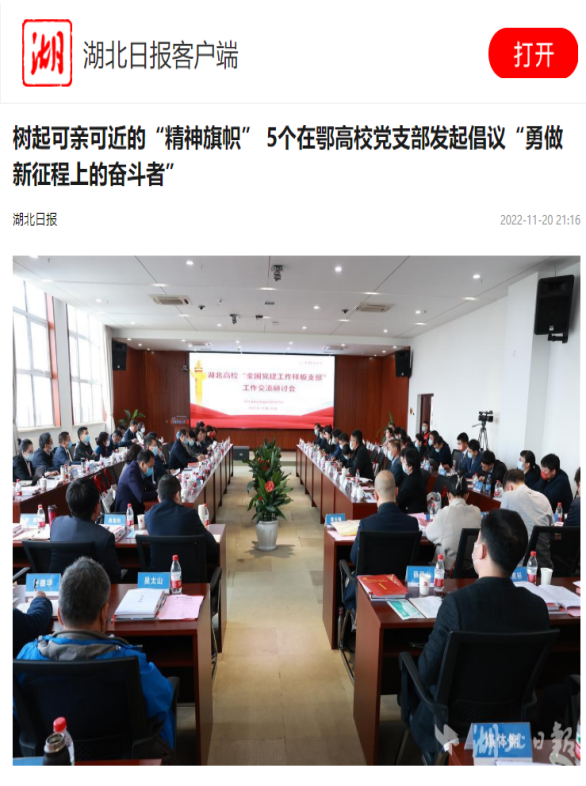 华中师范大学马克思主义学院恽代英班学生党支部、华中科技大学经济学院胡吉伟党支部、武汉理工大学材料科学与工程学院麦立强团队研究生党支部、中国地质大学(武汉)张国旗班党支部、湖北第二师范学院马克思主义学院黄大年教师党支部作为湖北省以英雄人物命名的“全国高校党建工作样板支部”联合发出倡议:学习贯彻党的二十大,加强政治建设,争做新时代的先锋队;践行初心使命,坚持自信自强,勇做新征程上的奋斗者;感悟精神伟力,赓续红色血脉,志做红色基因的传承人;弘扬英雄本色,培育时代新人,善做新赶考路上的排头兵。各支部表示将以“学习贯彻党的二十大精神、传承红色基因铸魂育人”为己任,通过组织互建、党员互动、活动互联、经验互鉴,筑强支部战斗堡垒,引领教育高质量发展,打造党建“双创”精品,促进全省高校党建工作提质增效。